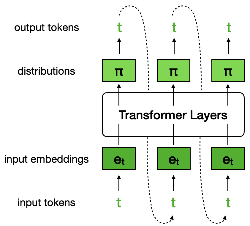 There’s one nuance: Transformers output a distribution over the vocabulary – a continuous vector that is in a difference space than the input discrete token. One apparent way to resolve this is to assume we’re using greedy decoding: taking the argmax token from the output distribution. While there are other decoding algorithms, they are stochastic and thus not suitable for defining FPs.