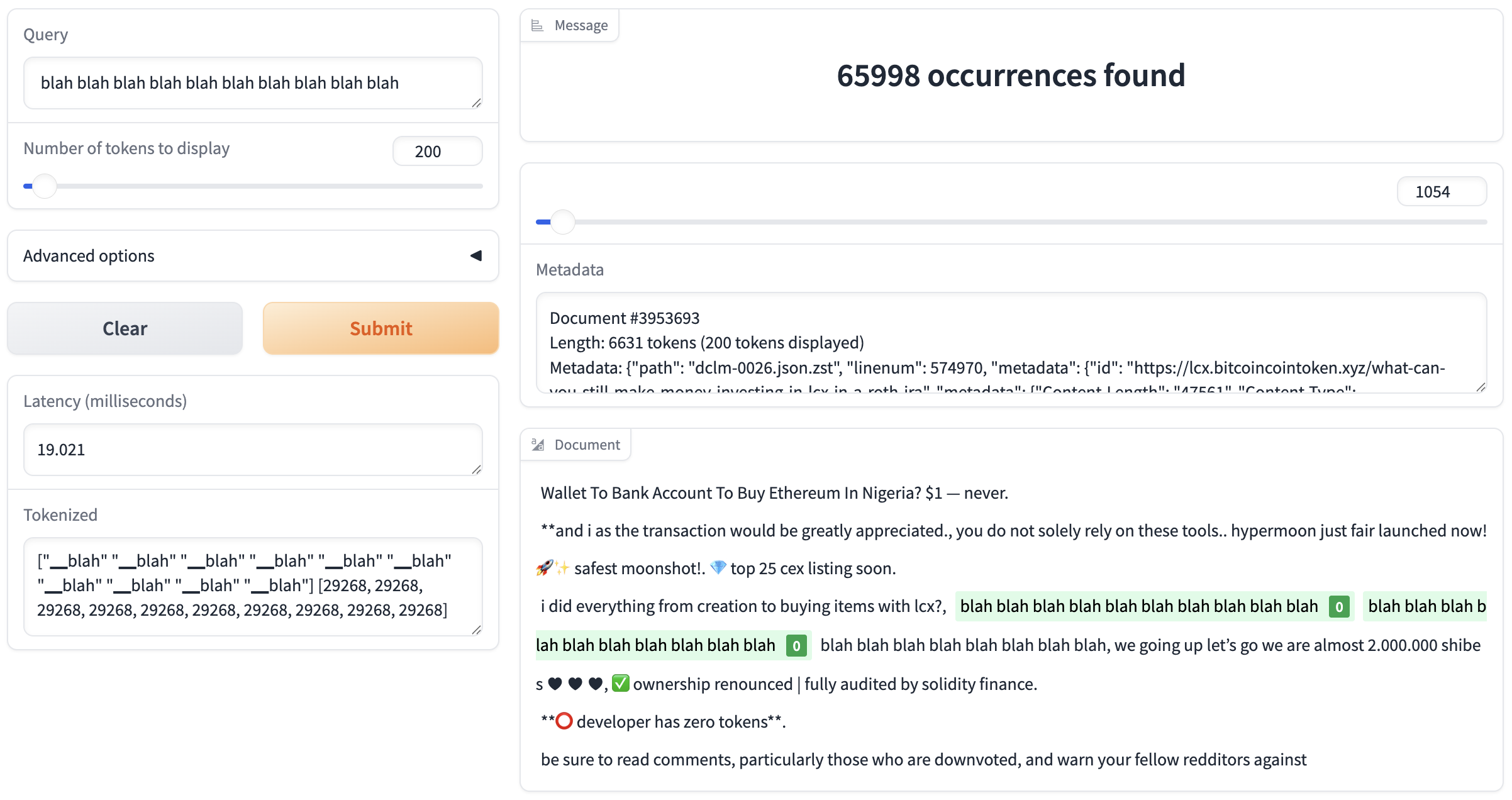 One nice thing with fully-open LLMs like OLMo 2 is that we can inspect the training data (with infini-gram search) to verify this.