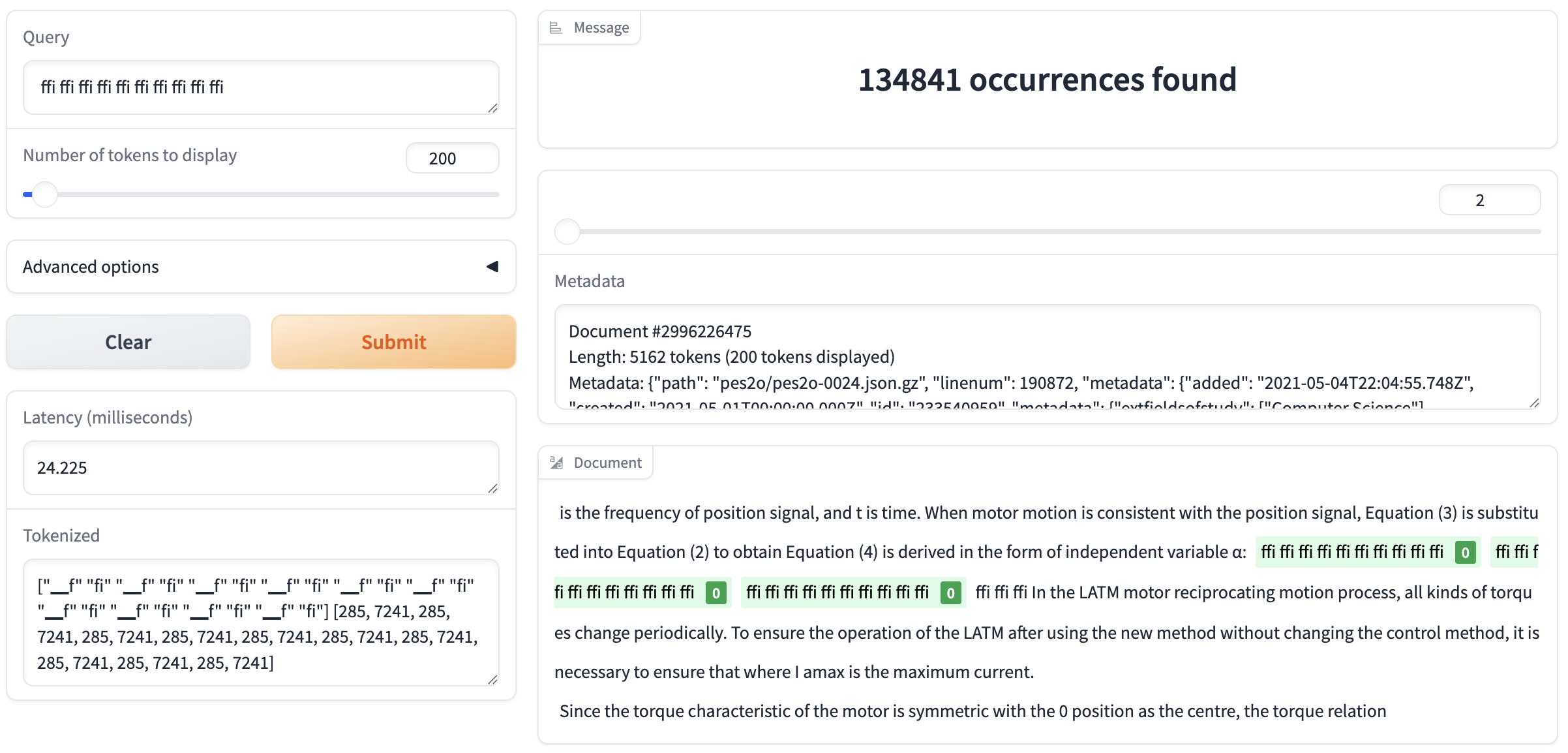 is an FP token of OLMo2-13B-Base, and we can find 66k occurrences of its 10-repetition:
