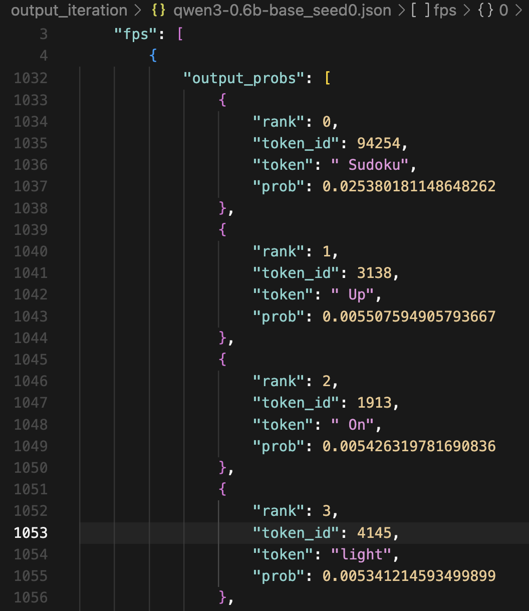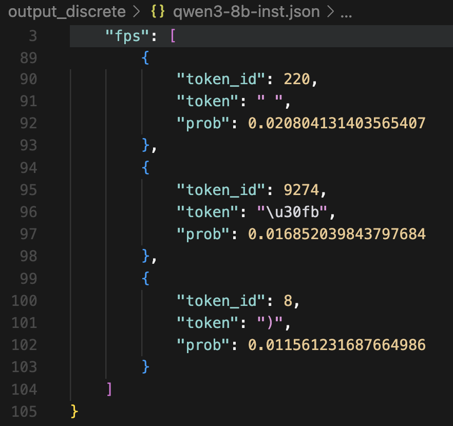Looking a bit closer into these FPs, we see that the output probability assigned to the FP tokens can vary a lot. It can be very close to 1.0 (a spiky distribution), very close to 0.0 (a nearly-uniform distribution), or something in the middle. For example, below are the top-3 and bottom-3 FP tokens of Qwen3-8B-Instruct: