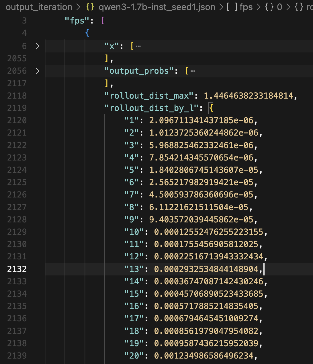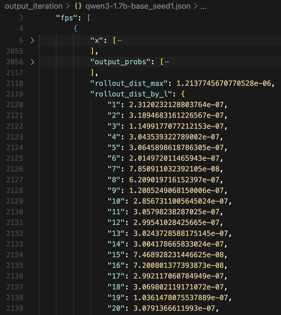 Numerical errors & “unstable” FP vectors. Due to floating point errors, the FP vectors we found are not strict FPs. Following our stopping criteria, the input and output vectors may have an L2 distance (i.e., an error) up to $10^{-6}$. Running more iteration steps could not further reduce this error down to 0. This creates a problem with the reduction we made at the beginning of this post – from solving $T([x, x, … x]) = [x, x, …, x]$ to solving $T([x]) = [x]$. With autoregressive decoding, the FP vectors might diverge due to these numerical errors.