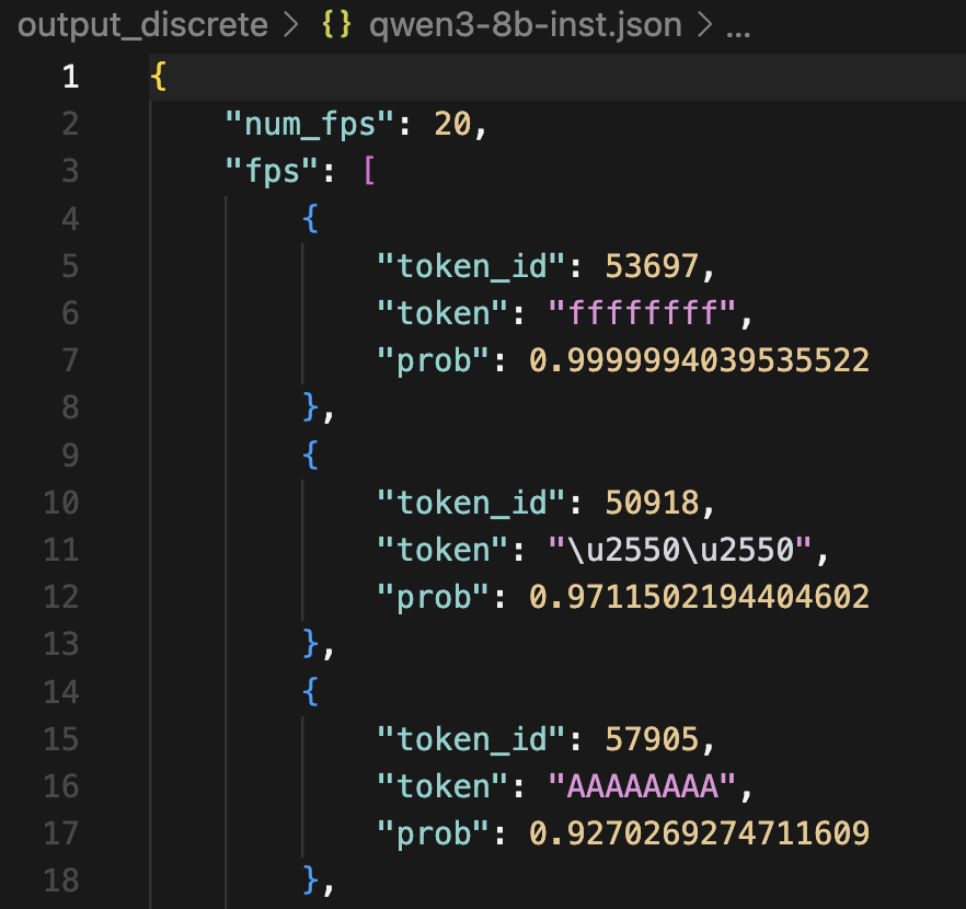 - All models tested have discrete token FPs. Base models have more FPs than their corresponding instruct models. (Possibly related: base models tend to degenerate and repeat more than instruct models.)