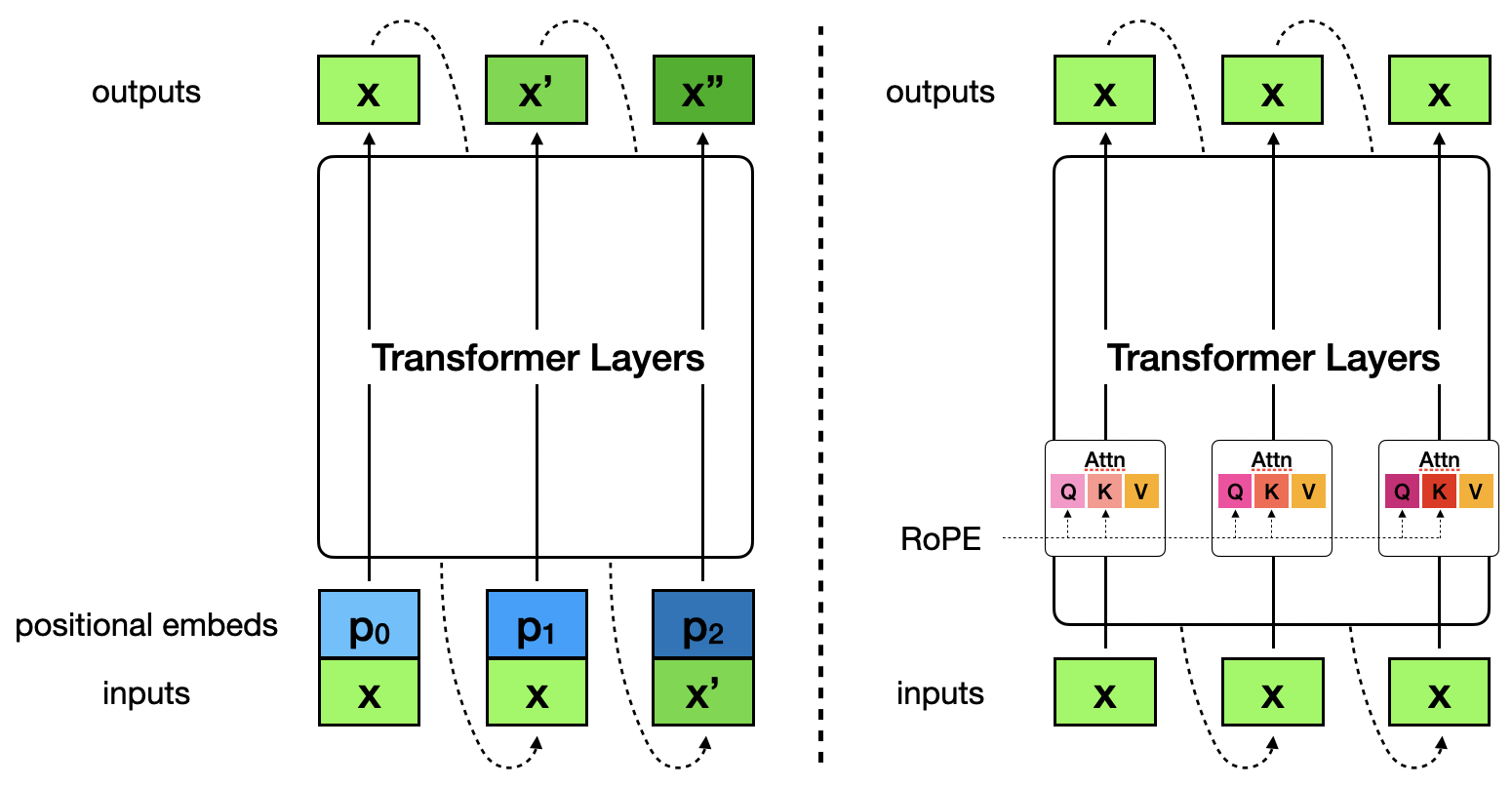Figure 2. Left: The original Transformer with positional encodings as part of the input; $[x] = T([x])$ does not guarantee $[x, x, …, x] = T([x, x, …, x])$. Right: Modern Transformers with RoPE; $[x] = T([x])$ implies $[x, x, …, x] = T([x, x, …, x])$ for arbitrary sequence length.